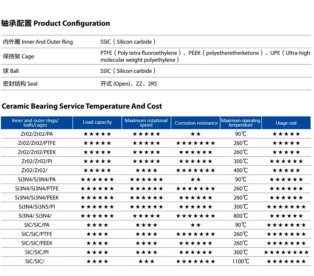 The hardnes, strength, high temperature resistance and impact resistance ofsic, pressureless sinteredSiC without free slicon are better than those of other engineering ceramics such as zirconia and reaction bonded siicon carbide, The sliconcarbide full ceramic bearing rings and rolling elements are made of pressureless silicon carbide (SSlC)I ceramic material, and the retainer uses PTFEas the standard conhguration.