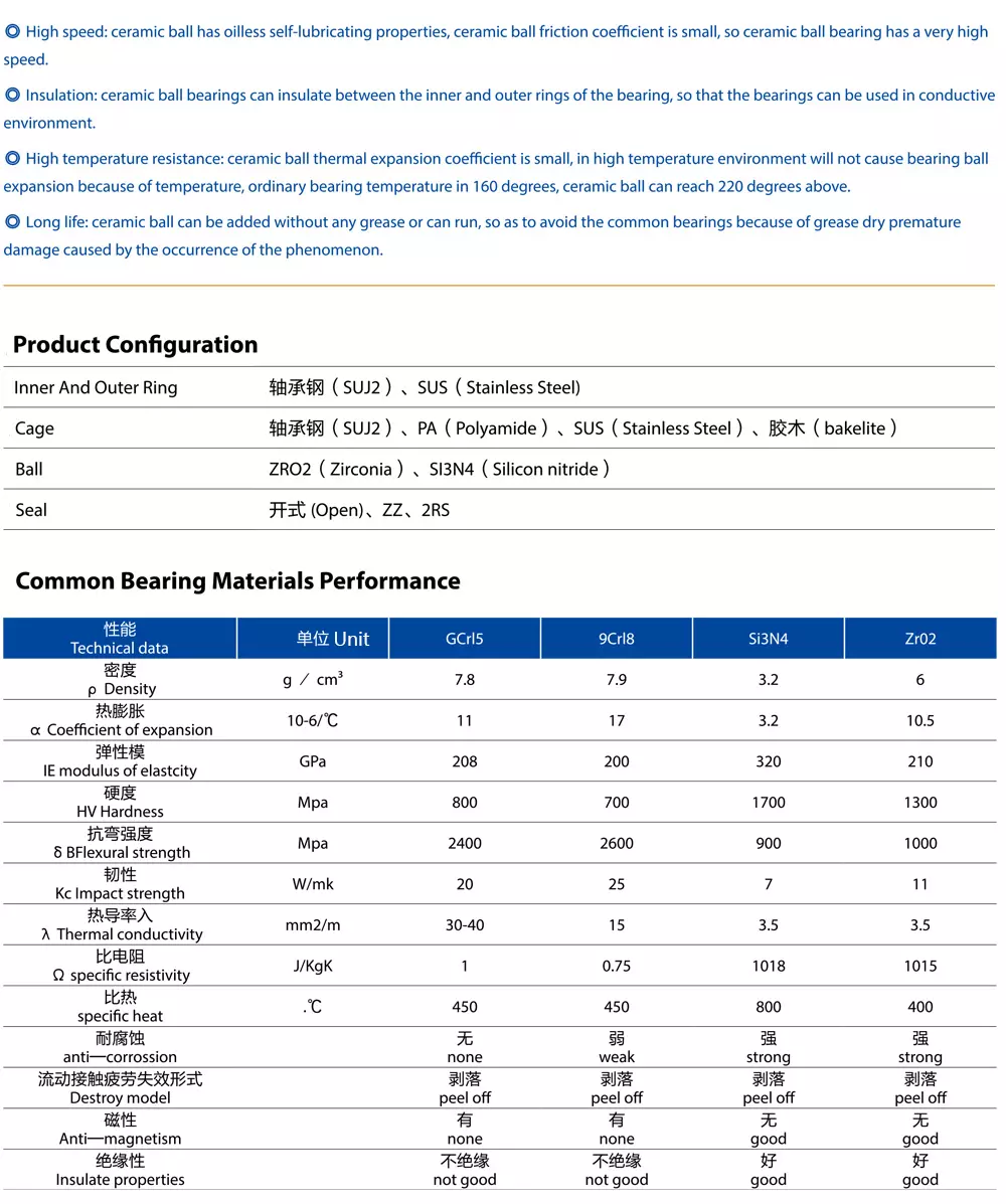 Ceramic ball has the characteristics of low density, high hardness.loww coefficient of friction, anti-magnetic insulation, wear-resisting,self-lubeication and good rigidity, Hybrid ceramic ball bearings thanodinary stainless steel or bearing steel bearings speed increased to 1.5times, service life increased to 2 to 3 times, can adapt to higher sorvicetemperature.