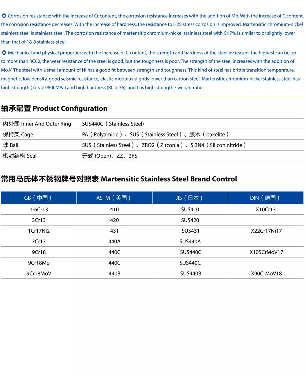 Compared with ordinary steel bearing, S440C martensitic stainlesssteel not only has obvious advantage in material, but also has strongerantirust and anticorrosion, In technology and precision control, it ismuch more strict than ordinary bearing, stable in work and low innoise. After quenching and tempering, the rings and rolling elementshave the characteristics of high mechanical strength, high loadcapacity and high rotational speed.